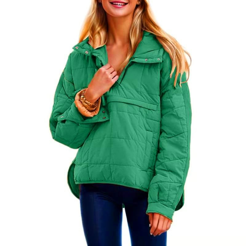Pull on, button closure Womens Quilted Lightweigh Puffer Jacket - features with cute hooded design, side split, half button, two side handy pockets and one invisible chest pocket, adjustable cuffs, solid color, loose fit, a stylish must-have in fall winter chilly days